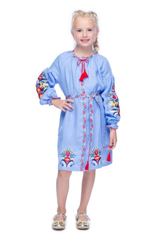 Стильное вышитое голубое платье это незаменимая вещь в гардеробе каждой маленькой украиночки. Платье имеет прямой свободный силуэт. Подчеркнуть талию поможет пояс с вышивкой, который прилагается к платью. Пояс и горловина украшены витыми шнурами с кисточками. Длинный рукав реглан, длина платья до колена и скрытые застежки-пуговицы - делают вещь практичной. Вышивка выполнена гладью и размещена на рукавах, горловине, вдоль застежек и по низу платья. Орнамент в виде загадочного, многоликого могучего дерева-цветки - символизирует материнскую силу Женщины. Образ Берегини - важный символ, встречающийся во многих орнаментальных композициях. Берегиня символизирует Дерево Жизнь, которое представляет собой сочетание трех миров и символом гармонии Вселенной