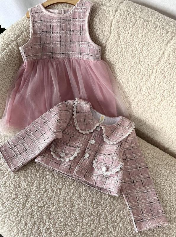 Сукня без рукавів та піджачок Верх сукні машинна в'язка На спинці два ґудзика Два слої фатину, прикрашений стразами Піджачок машинна в'язка Підкладка хб Прикрашене елегантними ґудзиками Виміри 80-Довжина сукні 46 см пояс 28*2 см Довжина піджака 26 см Рукав від горла 30 см 90-Довжина сукні 47 см пояс 29*2 см Довжина піджака 27 см Рукав від горла 31 см 100-Довжина сукні 48 см пояс 30*2 см Довжина піджака 28 см Рукав від горла 33 см 110-Довжина сукні 50 см пояс 31*2 см Довжина піджака 29 см Рукав від плеча 34 см