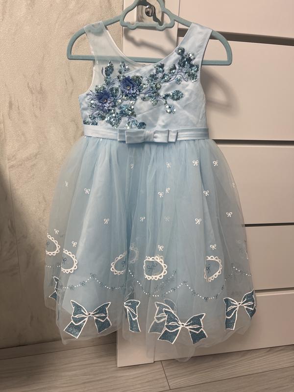 Дуже гарна сукня ніжно блакитного кольору. На чотири роки але краще орієнтуватися по замірах. Повна довжина- 59см. Верхній шар фатину -65см. Є фото з замірами.