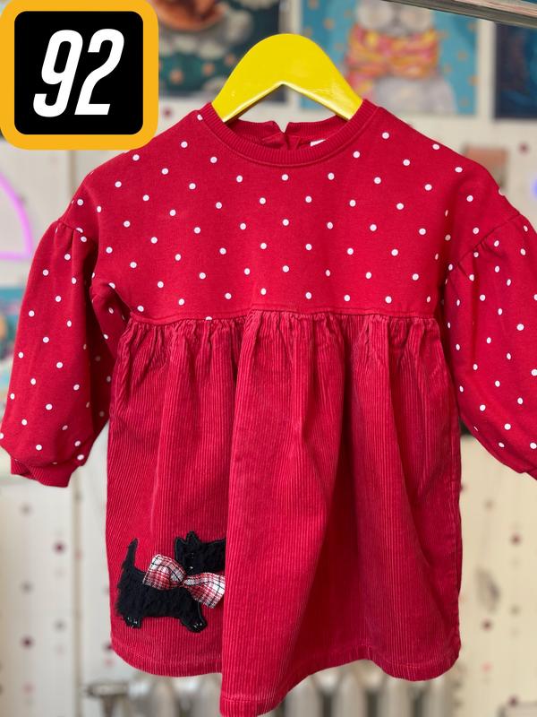 Стильна та дуже зручна сукня для дівчинки 1,5–2 років. Верх виготовлений із м’якого трикотажу в білий горошок, низ — із оксамитового вельвету, що тримає форму та виглядає святково. Прикрашена милим нашивним песиком із бантиком 🐾🎀. Сукня підходить як на кожен день, так і для святкових виходів. Стан — відмінний, без плям і пошкоджень. 🧩 Верх: 100% котон. Рукава: 100% котон. Низ: вельвет. 🏷️ Розмір 1,5–2 роки (92 см). 💰 Ціна — 300 грн. Заміри по запиту 🫶🏻