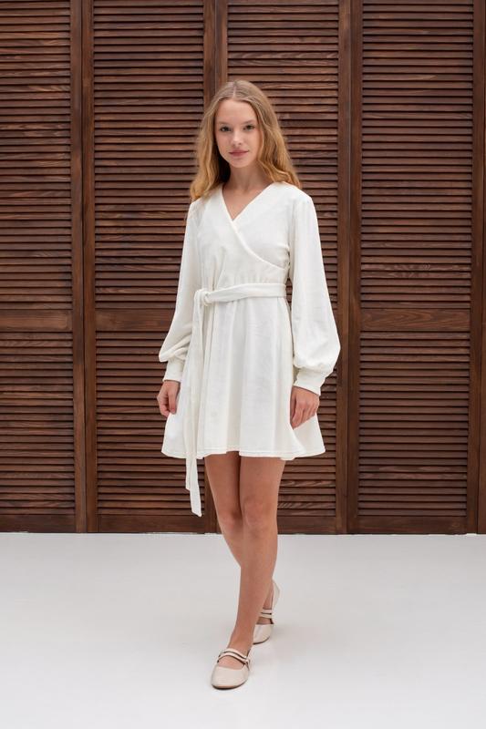 Стильное платье для модниц По спинке к поясу застегивается на молнию. Спереду на запах. Пояс в комплекте. Ткань королевский велюр, мягкий и нежный. Цвет- Молочный. Замеры: 140 длина - 69см, рукав от плеча - 52см, полуобхват груди - 38см 146 длина - 75см, рукав от плеча - 54см, полуобхват груди - 39см 152 длина - 79см, рукав от плеча - 57см, полуобхват груди - 41см 158 длина - 83см, рукав от плеча - 58см, полуобхват груди - 44см 164 длина - 87см, рукав от плеча - 63см, полуобхват груди - 45см Размеры в наличии: 152-1шт 164-1шт