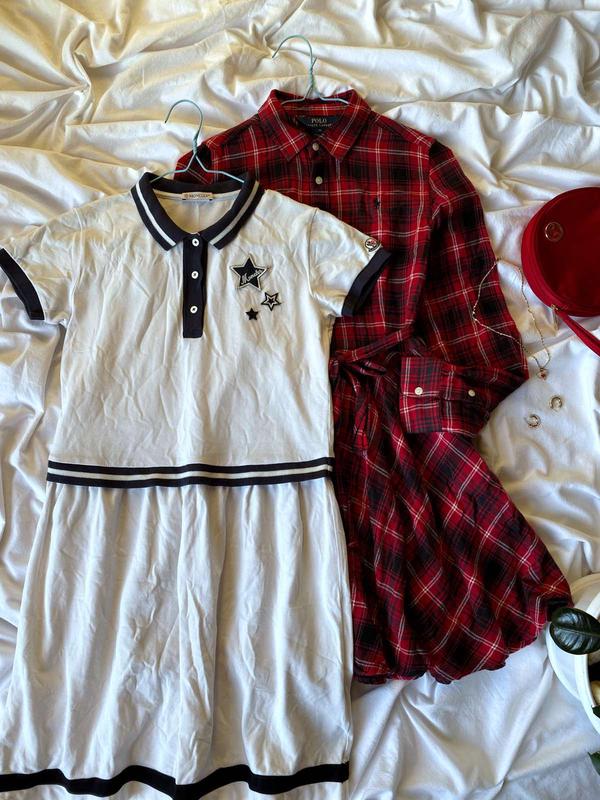 біле плаття-поло Moncler для дівчаток із темно-синіми смужками та нашивками у формі зірок, з впізнаваним об'ємним логотипом на рукаві. Розмір вказаний 14 років