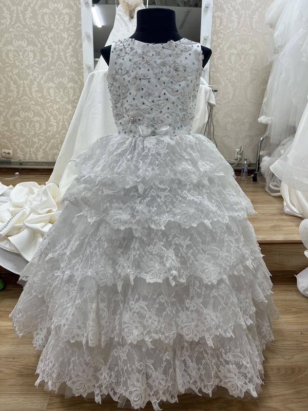 Оберт груді: 77см Оберт талії: 66см Довжина спідниці: 63см Висота від талії до плеча: 28.5см Матеріал: мереживо на спідниці, атласна основа, атласний верх, прикрашений камінчиками спереду Колір: атласний білий в комплекті йде круг підюбник, на 2 кільця