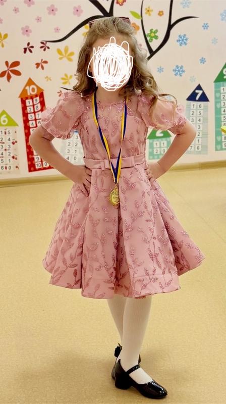 Дуже гарна блискуча сукня з бантиком-заколкою. Колір - пильна троянда.Ззаду на ґудзиках. Одягалась на випуск в садочок. Трошки тягнеться. Тканина - шовк Армані, верх - євро сітка з блискітками. Є пишний підʼюбник. Гарно тримає форму+ по низу регілін. За потреби надам заміри. Також можу скинути відео дитини в платті.