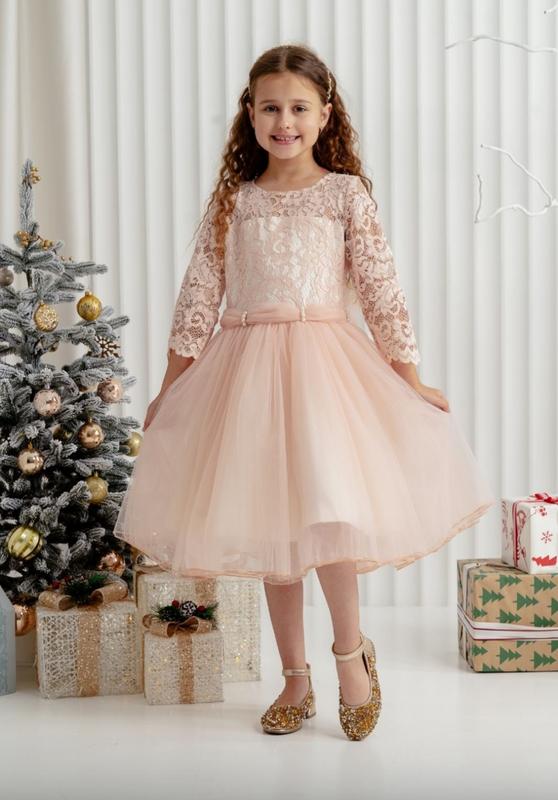 через кнопку купити тільки повна оплата!!! Святкова сукня для дівчат По спигці застібається на блискавку. Позаду зав'язується на бант. Рукав - 3/4 Тканина - мереживо+євросітка+атлас. Колір-бежева пудра. Заміри: 140 довжина - 84см, напівобхват грудей - 35см, рукав від плеча - 41см. Мс