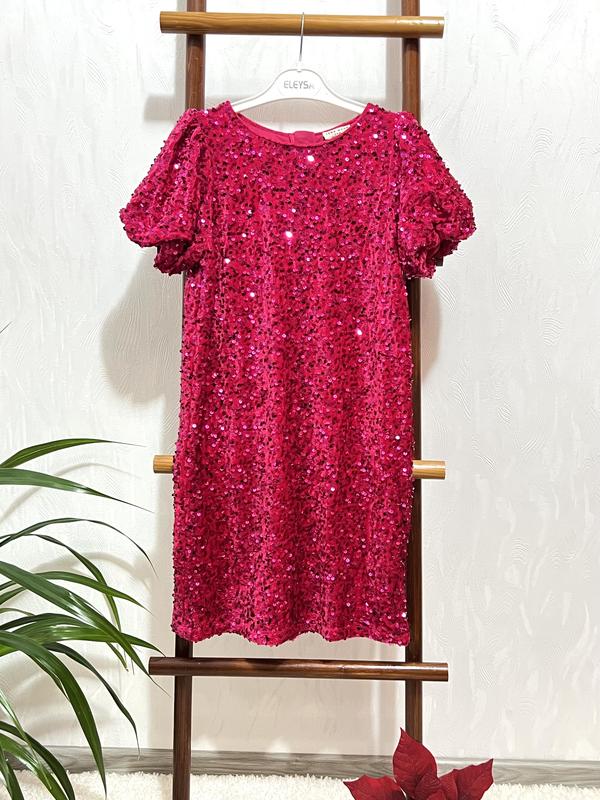 🎄Чарівна сяюча сукня від Luna Moon на 9-10 років, 134-140 см. ✨Ця сукня підійде на будь-яке свято, де буде притягувати погляди😍 та захоплені компліменти! ▪️оксамитова тканина розшита неймовірно сяючими паєтками🤩 ▪️нова, зірвана паперова бірка ▪️тканина 100 поліестер ▪️має мягеньку, тоненьку підкладку ▪️вироб. Індія 🇮🇳 Плечі 26.5 Пог 36, трішки тягнеться Довжина 73