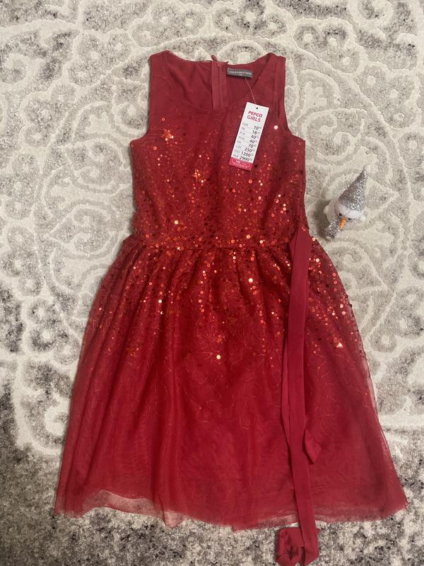 • Колір: Насичений червоний. • Стиль: Без рукавів, з круглим вирізом горловини, святковий або вечірній. • Оздоблення: Верхня частина сукні покрита блискітками (паєтками) або має мереживну фактуру з блискучим напиленням. • Спідниця: Має кілька шарів, ймовірно, верхній шар — фатин або тюль, що створює об'ємний та повітряний вигляд. • Деталі: • Присутній пояс або стрічка з тієї ж тканини, що зав'язується на талії. • Є етикетка PEPCO GIRLS, що вказує на бренд і можна прочитати "10-11 років"). • Сукня застібається на блискавку на спині (видно верхню частину блискавки). Сукня ідеально підходить для святкових подій, таких як Новий рік, Різдво, шкільні ранки чи дні народження.