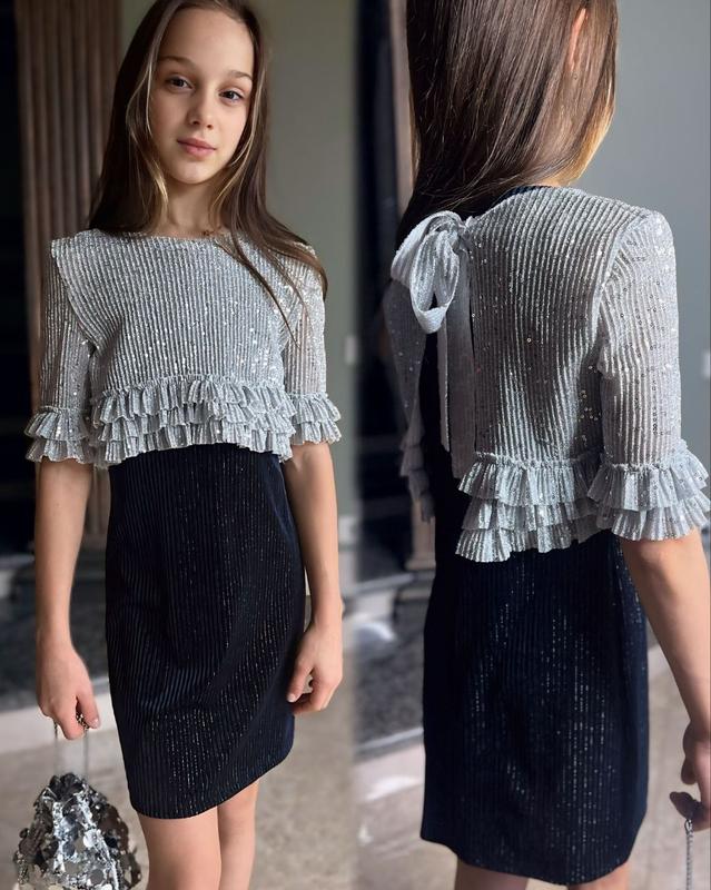 Стильна та святкова 2-ка Сукня + болеро Тканина: сукня оксамит з люрексом,болеро - трикотаж-діско з люрексом та пайетками Сукня на блискавці,тягнеться Розміри: 140см - 3шт 146см - 3шт 152см - 3шт 158см - 3шт Мд Заміри: Сукня: довжина/пог 140 - 70/34 146 - 73/34 152 - 75/35 158 - 78/36