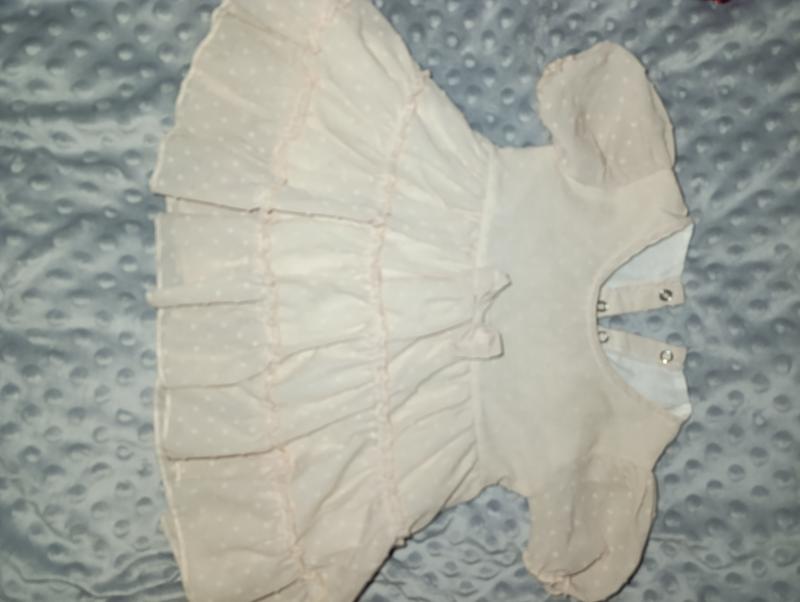 Ніжна,легка сукня для маленької красунечки. Ніжного бежевого кольору. На вік 6-9місяців. Легка мов хмаринка з ніжним візерунком та рукавчиками зефірками. Зручна, що в свою чергу літом дитинці буде в ній комфортно, з підкладкою тож не просвічується, без затяжок та дефектів, взаді на застібочках. Довжина сукні 38 см.