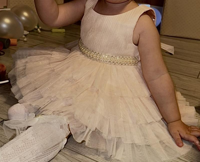 Дуже гарна сукня в ніжно персиковому кольорі с блискітками. Ідеальний стан, як нова. Вдягалась для фото. В комплекті йдуть шортики під сукню. Розмір 18-24 місяці. Точні заміри напишу в особисті повідомлення.