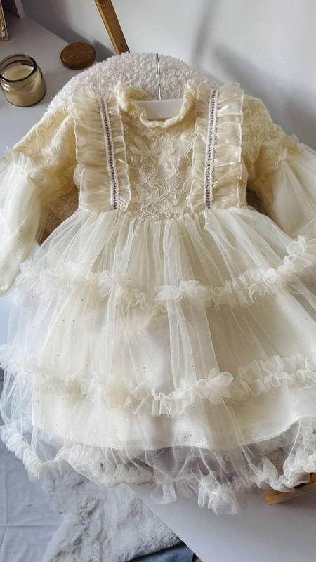 Витончена святкова сукня в молочно-білому кольорі — ідеальний вибір для особливих подій. Верх виконаний з елегантного гіпюру, що додає образу ніжності та вишуканості. Низ — фатин із легким блиском, який створює пишний, повітряний силует. Сукня має довгі напівпрозорі фатинові рукава з м’якими манжетами — виглядають дуже ніжно та не сковують рухів. На спинці модель застібається на зручну блискавку, що забезпечує легке одягання та комфорт у використанні. Заміри: • р.100 — довжина 53 см, ширина 30 см, плечі 23 см, рукав від плеча 33 см • р.110 — довжина 57 см, ширина 31 см, плечі 25 см, рукав від плеча 37 см • р.120 — довжина 60 см, ширина 34 см, плечі 27 см, рукав від плеча 40 см • р.130 — довжина 66 см, ширина 36 см, плечі 27 см, рукав від плеча 43 см • р.140 — довжина 71 см, ширина 37 см, плечі 30 см, рукав від плеча 45 см ‼️‼️‼️ Перед замовленням уточнюйте наявність потрібного розміру Повернення або обмін можливий відразу при огляді на пошті