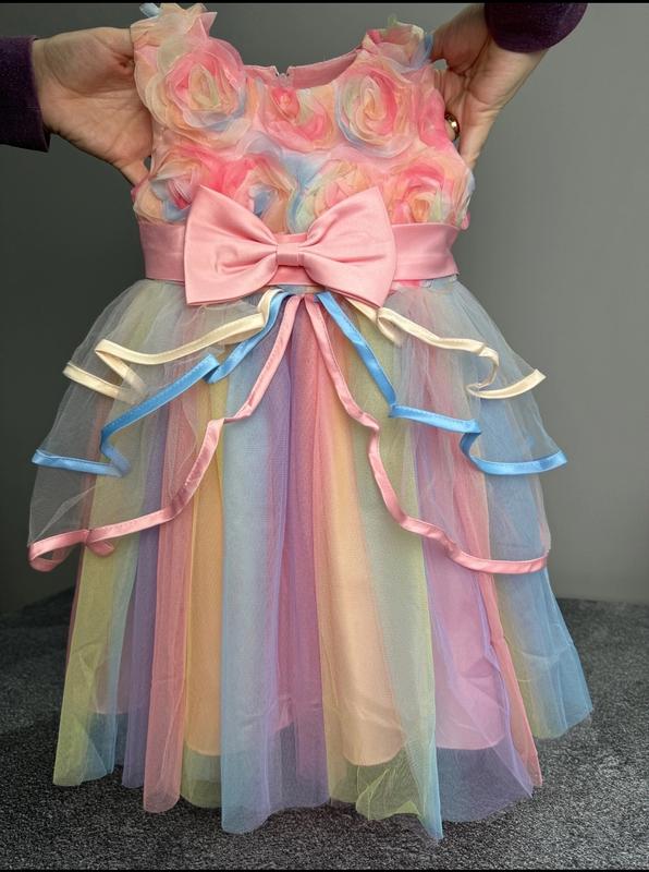 Шикарна сукня для ваших принцес 🔥 Идеально подойдет для будущих праздников, фотосессий, ранков и дней рождения ✨ Красивый радужный цвет😍 Верх украшен цветочками из фатина, низ - атлас +деколька слоев фатина. Застегивается сзади на молнию нс 140- длина 75 см, ширина 31 см (3 шт)