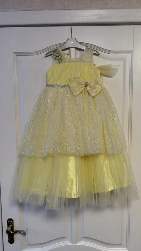 Святкове плаття ніжного жовтого, лимонного кольору з блискучим верхнім шаром. Є пояс - бант. Окремо два рукавчики, які можна пришити за бажанням. Пишна сукня. Сукня Бель, Красуня та чудовисько. Плаття принцеси. Нове. На бавовняній підкладці.