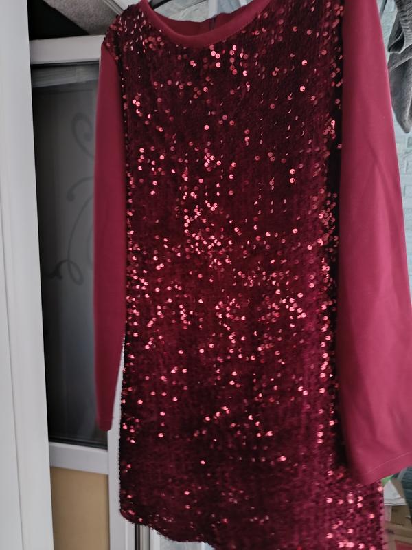 Бордове нарядне плаття з паєтками на зріст 158.Позаду на змійці.Длина плаття 76 см, довжина рукава 54см, ПоГ 37 см.Паєтки переливається.В гарному стані.