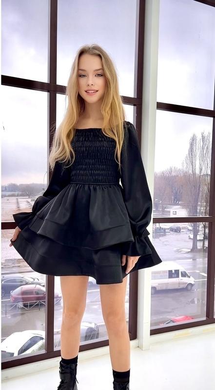 Шикарна сукня Florence Тканина- атлас. Колір - чорний. Заміри: 146 довжина від плеча - 67см, напівобхват грудей - тянеться до 40см, рукав - 62см. 152 довжина від плеча - 70см, напівобхват грудей - тянеться до 41см, рукав - 64см. 158 довжина від плеча - 75см, напівобхват грудей - тянеться до 43см, рукав - 68см. 164 довжина від плеча - 77см, напівобхват грудей - тянеться до 44см, рукав - 70см.
