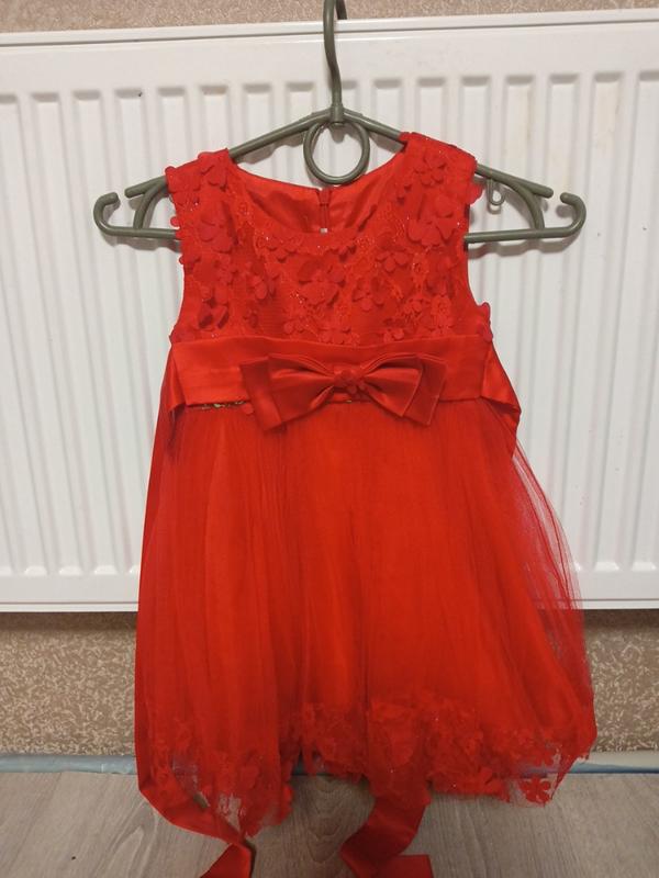 в ідеальному стані, одягнено на два свята і все, колір не такий яскравий як на фото, воно просто червоне, то так телефон фотографує) написано на 3 роки, можна і на 2 рочки буде нижче просто, талія регулюється бантом який ззаду зав'язувати довжина від плеча і до нізу 55 півобхват у талії 26