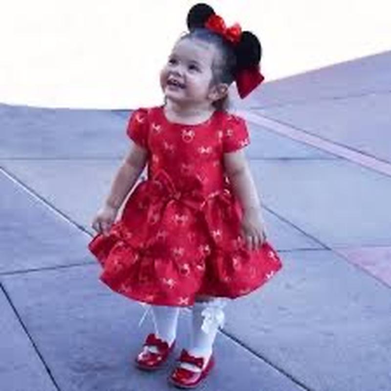 червона дитяча сукня Мінні Маус, імовірно, з колекції Disney Holiday Cheer. Деталі продукту Бренд: Disney Store Стиль: Святкова сукня з короткими рукавами та пишною спідницею Дизайн: Вкрита візерунком із золотистих іконок Мінні Маус та декорована великим 3D-бантом на талії Матеріал: Основна частина — поліестер із додаванням металізованої нитки, підкладка спідниці — бавовна