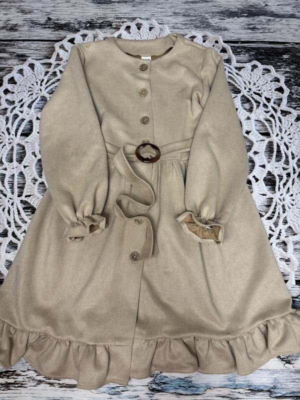 Бежеве красиве дівчаче плаття. Має поясок, на ручках є резиночки і красиві ґудзички. Довжина 77 сантиметрів, довжина рукава 51 сантиметр, пів обхват грудей 37 сантиметрів, талія 37 сантиметрів. Плаття зачіпається на ґудзики і має невеличку розпорку посередині.