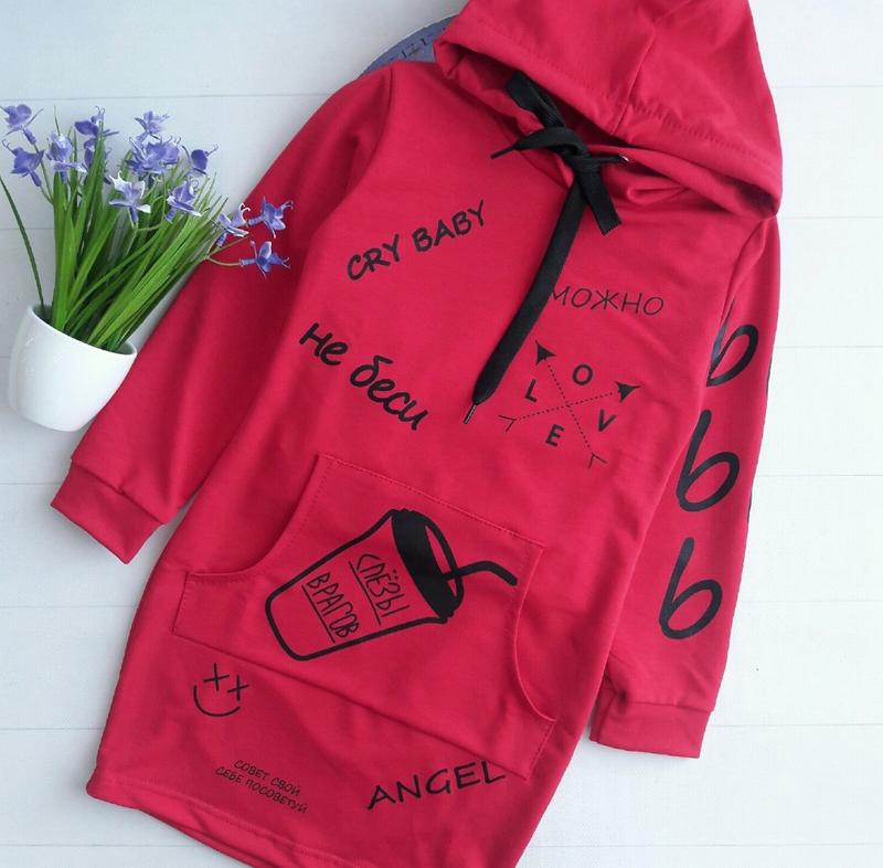 через кнопку купити тільки повна оплата!;! Сукня-туніка "Не беси" ⭐Тканина: трикотаж-двонитка. ⭐Колір: червоний ⭐Додатково: написи накат/спереду кишеня р.128-1шт р.128- довжина від плеча 64 см/ ПОГ 33 см/ рукав 42 см