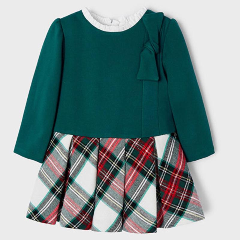 Зелена сукня для дівчинки Mayoral 53%віскоза; 20% поліамід; 15% поліестер;5% охолоджувач;4% еластан;3% вовна.підкладка 100% бавовна плаття з довгим рукавом для дівчинки Mayoral зеленого кольору, низ у ромб