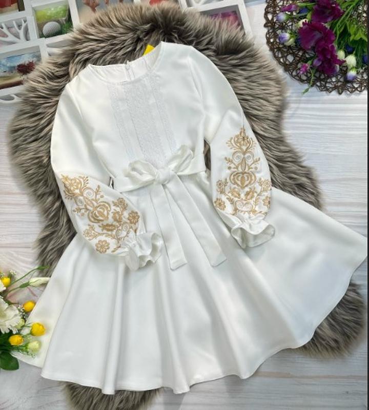 Ніжна сукня з вишивкою для красунь 💗 Застібається по спинці на блискавку, зав'язується під поясок Тканина костюмка Барбі Заміри : довжина/пог/рукав від плеча 122 - 64/30/43 128 - 69/31/45 134 - 71/32/47 140 - 72/33/49 с.