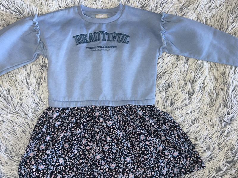 Сукня для дівчинки з квітковою спідницею 💙🌸 Ніжна та стильна сукня: м’який блакитний верх із рюшами та написом Beautiful, легка спідниця з квітковим принтом. Комфортна, гарно сидить. Стан відмінний.