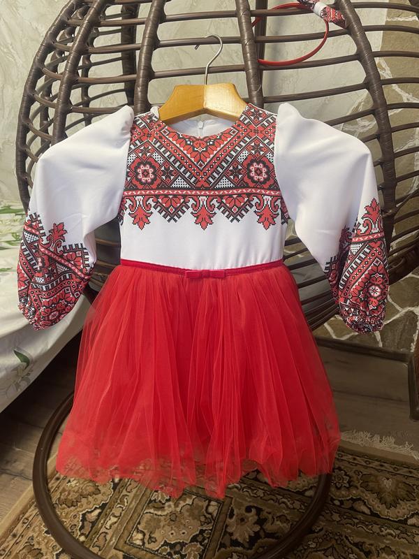 Сукня для дівчинки, вишиванка, стан ідеальний. Вік 6-7 років, фатінова спідничка. В комплект входить обруч. Довжина - 56 см; Рукав від плеча - 40 см; Від плеча до плеча - 24 см; В поясі - 27 см.