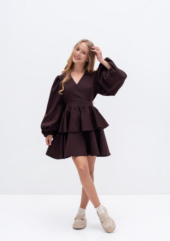 через кнопку купить только полная оплата!!! Сукня на запах Пояс пришит к платью, завязывается сзади. Тканина - костюмна. Цвет - шоколад. Замеры: 146 длина - 72см, полуобхват груди - 39см, рукав от плеча - 57см. 152 длина - 77см, полуобхват груди - 43см, рукав от плеча - 60см. 164 длина - 84см, полуобхват груди - 47см, рукав от плеча - 67см. Мч