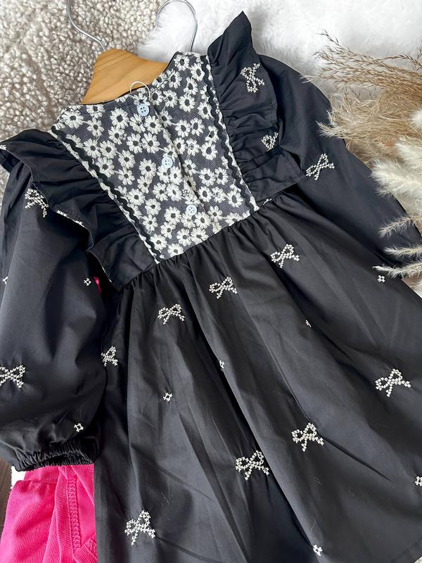 ✍ Невероятно нежное темное платье с изящным декором 🖤 🖤Стильная модель из гладкой ткани (приемная на ощупь, напоминает хлопок). 🖤 Декорирована нежными вышитыми цветами и бантиками 🖤 Контрастная вставка с цветочным кружевом спереди 🖤 Объемные рукава с мягкими резинками для комфортной посадки 🖤 Застежка на пуговицы по спинке - удобно надевать 🖤 Свободный крой - не сковывает движений Платье смотрится очень элегантно и одновременно мыло 🖤 90(3 шт) 100(3 шт) 110(3 шт) 120(3 шт) 130(1 шт) 90-Длина 51см рукав от плеча 29см пояс 27*2см 100-Длина 55см рукав от плеча 32см пояс 28*2см 110-Длина 58см рукав от плеча 34см пояс 30*2см 120-Длина 61см рукав от плеча 36см пояс 32*2см 130-Длина 65см рукав от плеча 39см пояс 33*2см Замеры сделаны одной ростовки Допустима похибка +-1-2 см