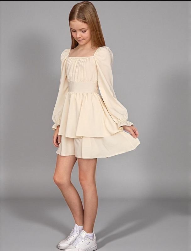 через кнопку купить только полная оплата!!!! Нежное платье ✨ Легкая и воздушная модель в трендовом оттенке 🤍 Идеальный вариант для прогулок, праздников и фотосессий 📸 ▫️ Ткань: софт - мягкая, приятная к телу ▫️ Сзади в поясе резиночка - комфортная посадка и удобство в движении ▫️ Объемные рукава и многослойная юбочка добавляют особый шарм Стиль + комфорт в одном образе 💫 р.134-1шт р.140-1шт р.152-1шт ЗАМІРИ ⤵️ +/- 1-2см!!! р.134- длина платья от плеча 65см/ рукав от плеча 50см/ ПОГ 28см/ ширина талии 26см (тянется)/ длина юбки 35см. р.140- длина платья от плеча 68см/ рукав от плеча 52см/ ПОГ 28см/ ширина талии 26см (тянется)/ длина юбки 37см. р.152- длина платья от плеча 76см/ рукав от плеча 60см/ ПОГ 30см/ ширина талии 28см (тянется)/ длина юбки 41см. Кр
