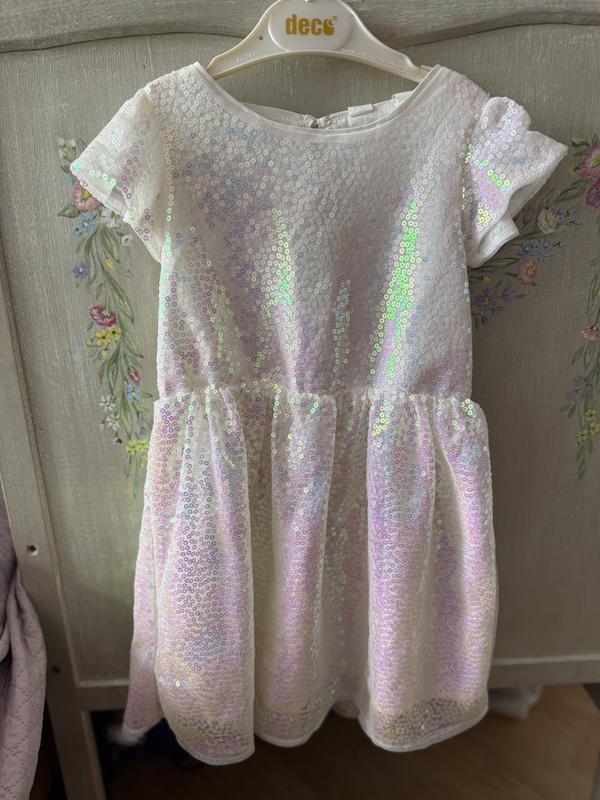Очень красивое платье в паетках H&M . Размер указан 2-3, но будет лучше на 3-4. На подкладочке,палетки не колят