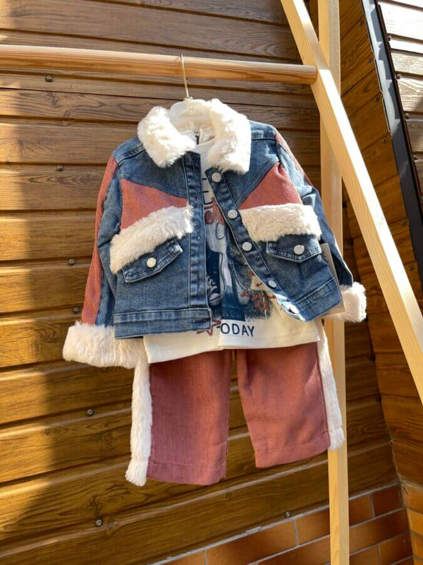 Якісний та стильний набір трійка виробництва Туреччина! Куртка джинс комбінована із вельветом. Застібається на кнопки! Реглан- трикотаж, довгий рукав, із принтом. Штани- кюлоти з вельвету, з хутряними вставками з боків. Якість – люкс! Розміри: 80 – куртка рукав 28, довжина 30, півобхват грудини 25, кюлоти довжинв 42/ крок 26 92- куртка рук 30, довжина 31, пог 25, кюлоти 48/29 98- куртка рук 31, довжина 35, пог 26, кюлоти 52/32 104- куртка рук 34, довжина 35, пог 29, кюлоти 57/35 110- куртка рук 36, довжина 37, пог 29, кюлоти 63/39
