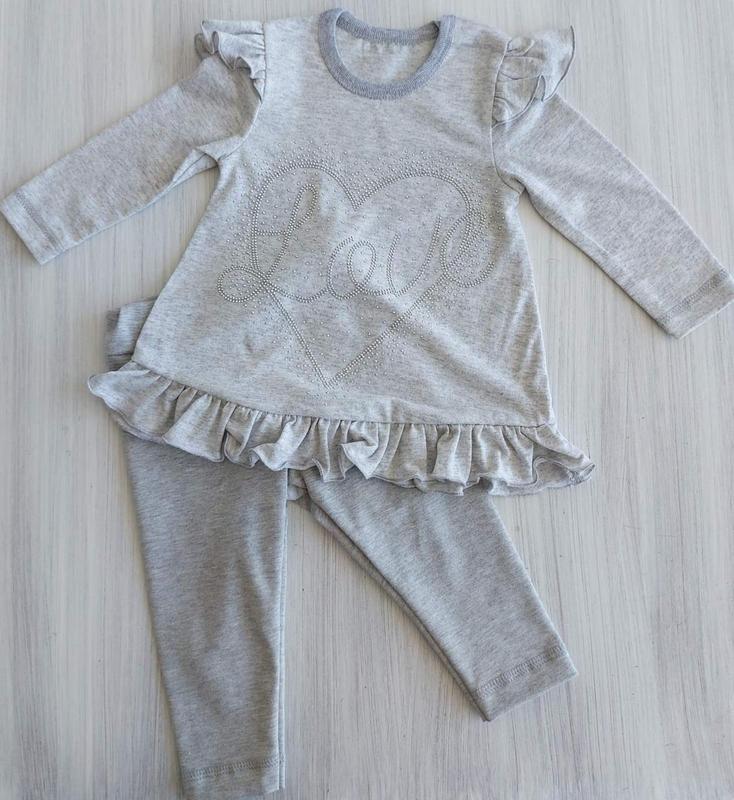 Легкий комплект пошитий з натурально і легкої тканини стрейч-кулір. Він ідеально підійде для прогулянок літніми вечорами. Виглядає нарядно, попереду вишивка з страз. Розмір 74, 80 Колір сірий