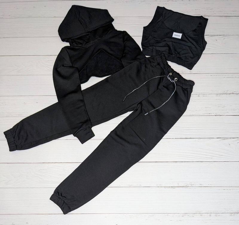 Костюм 3-ка Топ-кофта+джогери+майка😍 Штани верх і низ на резинці, дві бокові кишені. Тканина: двонитка петля Люкс якість🔥 Не кошлатиться Розмір: 140 см - штани: довжина 84 см, крок 60 см; Топ-кофта: довжина по спинці (без капюшона) 20 см, ширина см, рукав 54 см; Майка: довжина 30 см, ширина 34 см (тягнеться).
