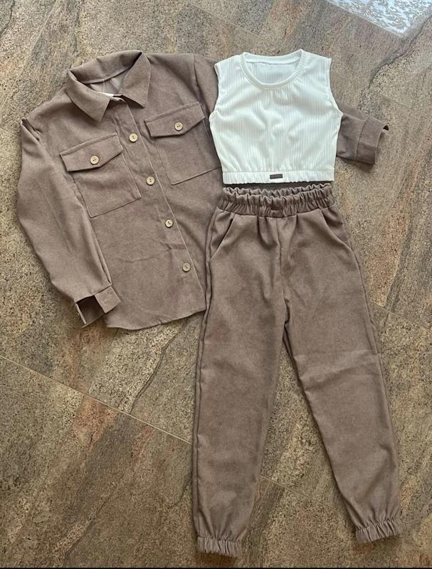 Крутезний костюм трійка для дівчинки рубашка+ топ+ штани джогери тканина вельвет,топ хлопок РЕКОМЕНДУЮ заміри:довжина рубашки/пог/довжина рукава від плеча/ довжина топа/ ширина/ довжина штанів/крок/бедра/ пояс 128-134-58/46/47/30/33/79/54/40/24 164-170-67/50/54/34/38/100/72/47/28 +-2см Ирд