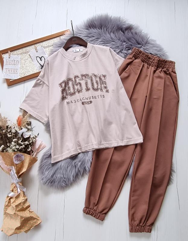🌿Костюми Бостон,спорт джогери та футболка з накатом. 📌Тканина-брюки турецька двонитка+ футболка кулір. РЕКОМЕНДУЮ! 140(2 шт)-довжина футболки 53,пог 53,довжина штанів 83,крок 61,пот 27,поб 42 146(1 шт)-довжина футболки 57,пог 54,довжина штанів 86,крок 63,пот 28,поб 43 152(1 шт)-довжина футболки 60,пог 55,довжина штанів 89,крок 65,пот 29,поб 44 158(1 шт)-довжина футболки 62,пог 57,довжина штанів 94,крок 68,пот 30,поб 46 164(1 шт)-довжина футболки 65,пог 59,довжина штанів 98,крок 72,пот 32,поб 49 +-2см