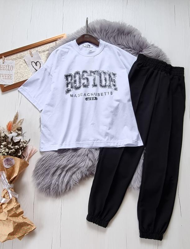 🌿Костюми Бостон,спорт джогери та футболка з накатом. 📌Тканина-брюки турецька двонитка+ футболка кулір. РЕКОМЕНДУЮ! 140(2 шт)-довжина футболки 53,пог 53,довжина штанів 83,крок 61,пот 27,поб 42 146(1 шт)-довжина футболки 57,пог 54,довжина штанів 86,крок 63,пот 28,поб 43 152(1 шт)-довжина футболки 60,пог 55,довжина штанів 89,крок 65,пот 29,поб 44 158(1 шт)-довжина футболки 62,пог 57,довжина штанів 94,крок 68,пот 30,поб 46 164(1 шт)-довжина футболки 65,пог 59,довжина штанів 98,крок 72,пот 32,поб 49 +-2см