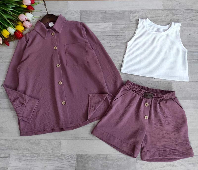 Хітовий костюмчик цього літа 😍😍👍👍👍 Сорочка дуже легенька , майже не відчувається на тілі 🥰🥰🥰🥰 По всій довжені є гудзики . В поясі шорт є резиночка та з обох боків кишені , топ з якісного рубчика , тканина тягнеться 😍 Рекомендуємо 👍👍👍👍👍 Тканина: жатка ( рубчик мустанг ) Виробник : Україна 🇺🇦 ЗАМІРИ ⤵ +/- 1-2см!!! ◾р.140- Сорочка: довжина 60см / рукав від горловини 61см/ ПОГ 48см. Шорти : довжина по бічному шву 33см/ крок 11см/ ширина стегон 41см. Топ: довжина від плеча 32см/ПОГ 31 см ◾р.146- Сорочка: довжина 61см / рукав від горловини 63см/ ПОГ 49см. Шорти : довжина по бічному шву 34см/ крок 12см/ ширина стегон 45см. Топ: довжина від плеча 34см/ПОГ 32 см ◾р.152- Сорочка: довжина 62см / рукав від горловини 65см/ ПОГ 51см. Шорти : довжина по бічному шву 34см/ крок 13см/ ширина стегон 46см. Топ: довжина від плеча 36см/ПОГ 33 см ◾р.158- Сорочка: довжина 65см / рукав від горловини 66см/ ПОГ 52см. Шорти : довжина по бічному шву 34см/ крок 13см/ ширина стегон 46см. Топ: довжина від плеча 36см/ПОГ 35 см ◾р.164- Сорочка: довжина 66см / рукав від горловини 68см/ ПОГ 53см. Шорти : довжина по бічному шву 36см/ крок 13см/ ширина стегон 48см. Топ: довжина від плеча 36см/ПОГ 36 см