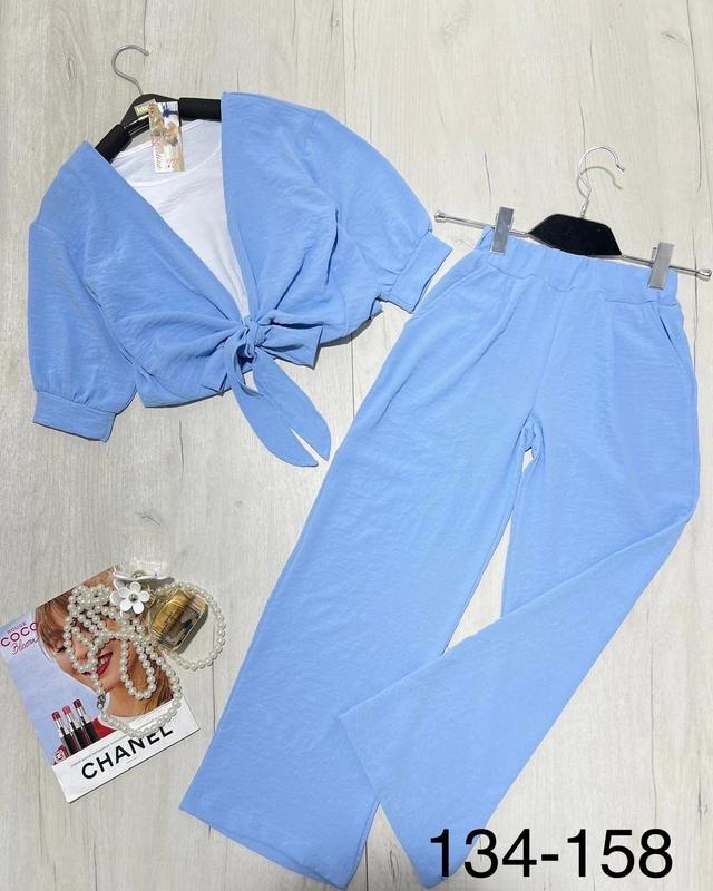 Таня Неймовірно ніжний костюм Трійка( блузка+топ+палаццо) Тканина жатка Блузка на запах Рекомендую Зріст/довж.бл./пон/довж.топа/пог/довж.штанів/крок/пот/поб похибка+-2см 134/44/39/30/34/82/58/25/42-2шт 140/47/42/32/36/84/60/26/43-1шт 146/50/45/34/38/86/63/27/44-1шт 158/53/47/37/42/93/69/29/47-1шт