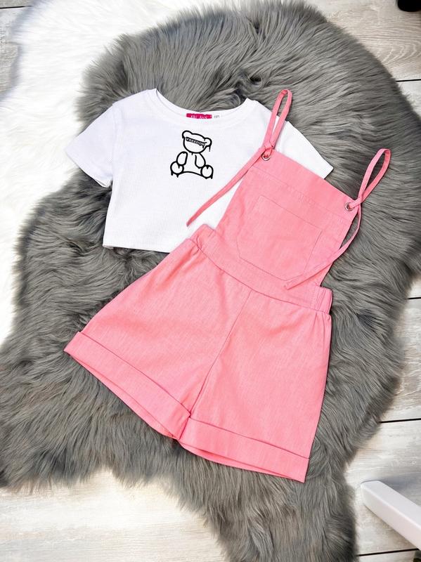 дуже стильний і красивий, футболка+комбінезон, Тканина льон і рубчик, Є кишенька, Гарна якість! довжина/пог/довжина комбеза/довжина шорт/п**********/29/26 122-25/31/46/29/27 128-26/32/47/30/27 134-28/33/48/30/28