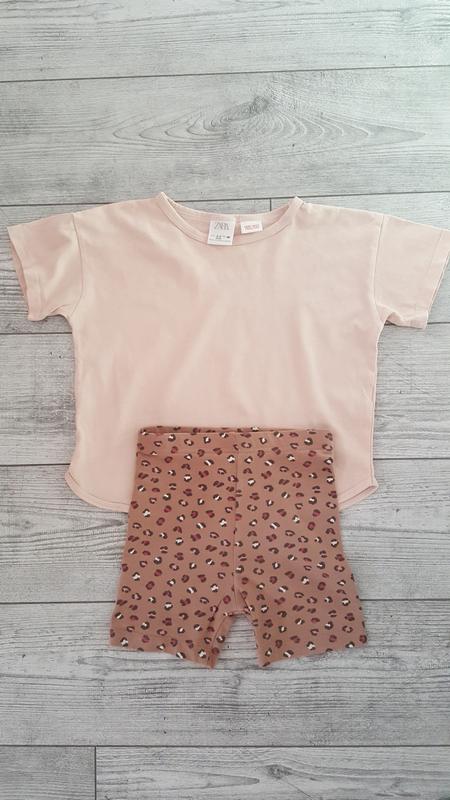 Прохання через кнопку КУПИТИ оформлювати після домовленості Набор костюм комплект для девочки футболка Zara и шорты George. Футболка свободного кроя, рукав реглан, небольшой круглый вырез горловины. Указан размер 2-3, можно и на больше за счет кроя. Шорты велосипедки трикотажные, на талии резинка, леопардовый принт, хорошо тянутся.