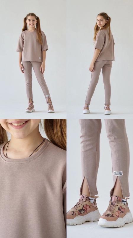 Якісний та стильний костюм для модниці Подовжена футболка Штани з розрізами Тканина двонитка Дуже гарно виглядає на дітках Ціна 800 грн 128-1 шт 134-1 шт Довжина футболки/Пог/довжина штанів/крок/резинка 128-46/44/76/55/24 134-47/45/78/57/26