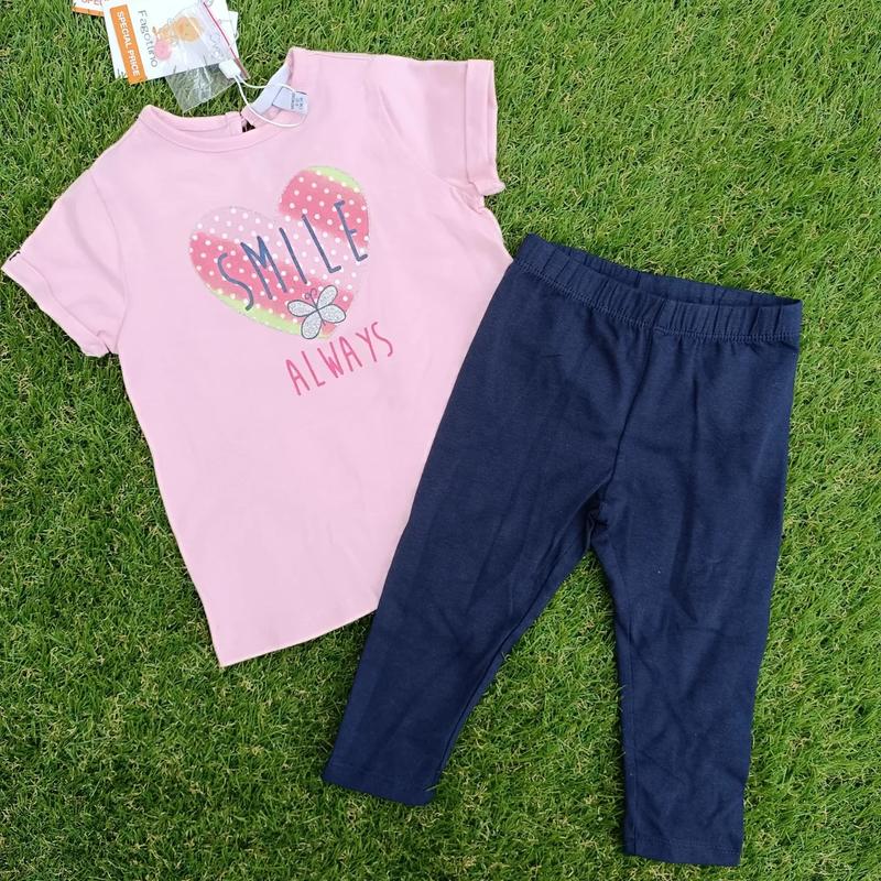 Комплект на дівчинку Футболка і бриджі OVS Італія 95% бавовна 5% еластан Малюнок сердечко в блискітках Розмір 9-12 міс. 74 см 📐Футболка -довжина 33 см, ширина по грудях 25 см 📐Бриджі -довжина 36 см, крок 22 см, пояс 18 см