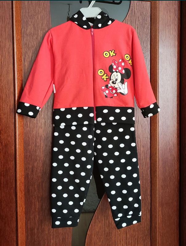 Дитячий костюм на дівчинку, новий з біркою, без дефектів. Кофта на замочку, штани на резинці, капюшон з вушками Мікімауса. Вироблено в Україні, матеріал двонитка. В наявності 74-80 см (По бірці українські розміри 24) Ціна 280 грн. За додатковими параметрами звертайтесь в ПП.