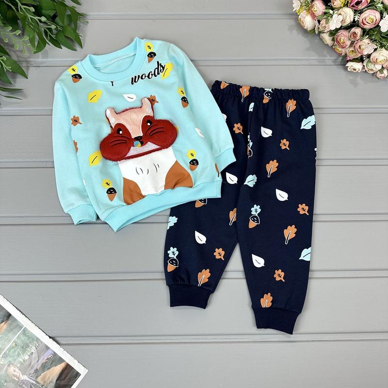 Костюм білка блакитний . Малюнок - накат, мордочка вишита. Штанішки усипані горішками та листочками. Тканина двунитка. Склад тканини: 100% бавовна 📐Заміри: 86 - довж. кофтинки 33/напівобхв. 26 /рук. 27 /довж. шт.42 /крок 23 92 - довж. кофтинки 36 /напівобхв. 27/рук. 29/довж. шт. 44 /крок 25 98 - довж. кофтинки 38/напівобхв.28 /рук. 31 /довж. шт. 47 /крок 28