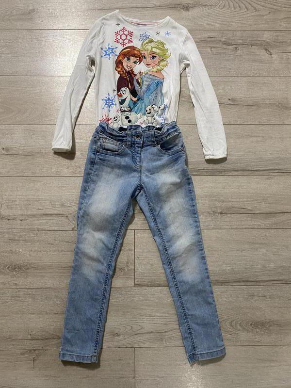 Брюки застегиваются на замок молнию и железную пуговицу Есть два кармана спереди и два сзади приталенный Фасон Есть резинка на талии для регулировки размера Кофта Рукава длинные снизу тоненькие резинки Воротник круглый впереди диснеевский рисунок Анны и Эльзы Из нюансов-е незначительные следы носка на фото указано