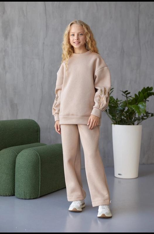 Штани + світшот з колосками. На рукавах вишивка - не малюнок! Штани внизу стягуються фіксатором. Колір - бежевий. Тканина - тринитка піньє на флісі. Якість відмінна! Заміри: 128 свтшот довжина - 51см, напівобхват грудей - 43см, рукав від горловини - 54см. штани довжина - 77см, крок - 53см, пояс - 25см напівобхват бедер - 40см 134 свтшот довжина - 53см, напівобхват грудей - 44см, рукав від горловини - 56см. штани довжина - 82см, крок - 59см, пояс - 26см напівобхват бедер - 42см 140 свтшот довжина - 56см, напівобхват грудей - 47см, рукав від горловини - 58см. штани довжина - 86см, крок - 62см, пояс - 27см напівобхват бедер - 44см БЕЖ. 146 свтшот довжина - 59см, напівобхват грудей - 48см, рукав від горловини - 63см. штани довжина - 90см, крок - 66см, пояс - 28см напівобхват бедер - 45см 146 свтшот довжина - 62см, напівобхват грудей - 50см, рукав від горловини - 65см. штани довжина - 95см, крок - 70см, пояс - 29см напівобхват бедер - 46см 🌴