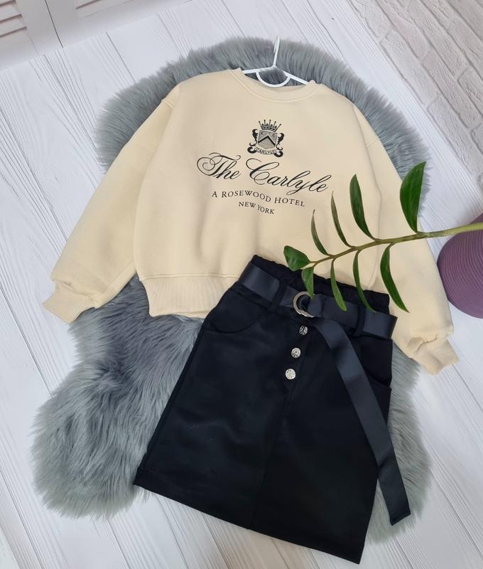 Стильний костюмчик світшот з прорезиненим надписом та спідничка спідничка - замш на дайвінгу світшот тканина тринитка пеньє на флісі НЕ КОШЛАТИТЬСЯ ЧУДОВА ЯКІСТЬ! 158(1 шт)-довжина світшота 55,пог 51,рукав 67/51,довжина спіднички 49,пояс 33 +-2 см