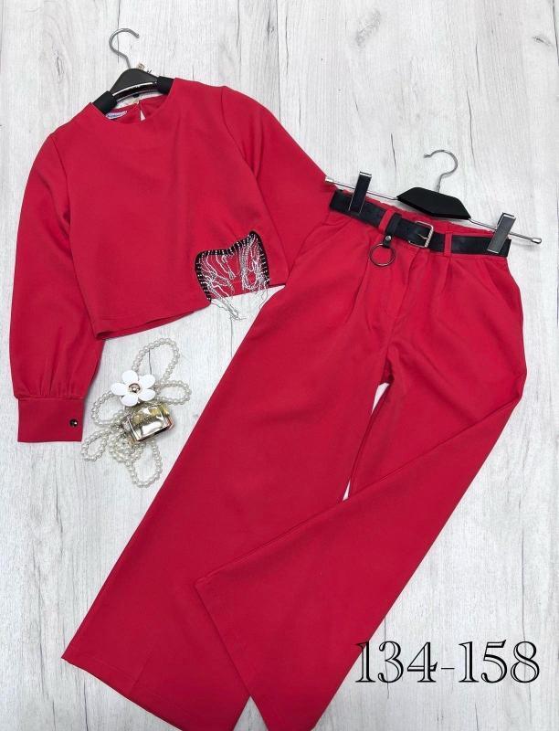 Тканина костюмна, кофта оздоблена нашивки з ланцюжками, Рукав на широкому манжеті . Брюкі палаццо, у поясі позаду є резинка, застібаються на блискавку. Зріст/довжина/пог/Рукав від горловини/довжина брюк/крок/пот/поб. Похибка +-2см. 152/45/43/62/96/70/30/47 - 1 шт.