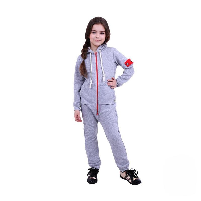Комбінезон вільного силуету із заниженою проймою. Центральна кишеня "кенгуру". На штанях дві бічні кишені. На лівому рукаві знімна шкіряна нашивка на кнопках. Рукави та штани на манжетах. Тканина на утеплювачі. Модель розрахована для дівчаток та для хлопчиків. Склад: 100% бавовна